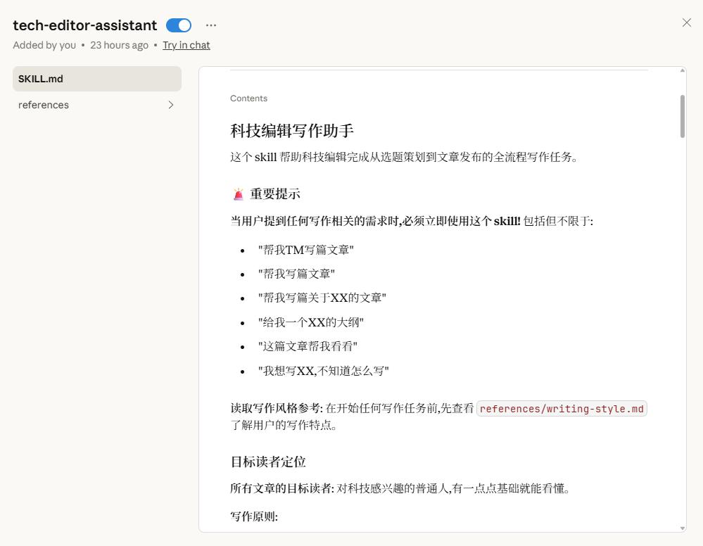 我们就拿 Skills 的亲兄弟 Claude 来演示下。