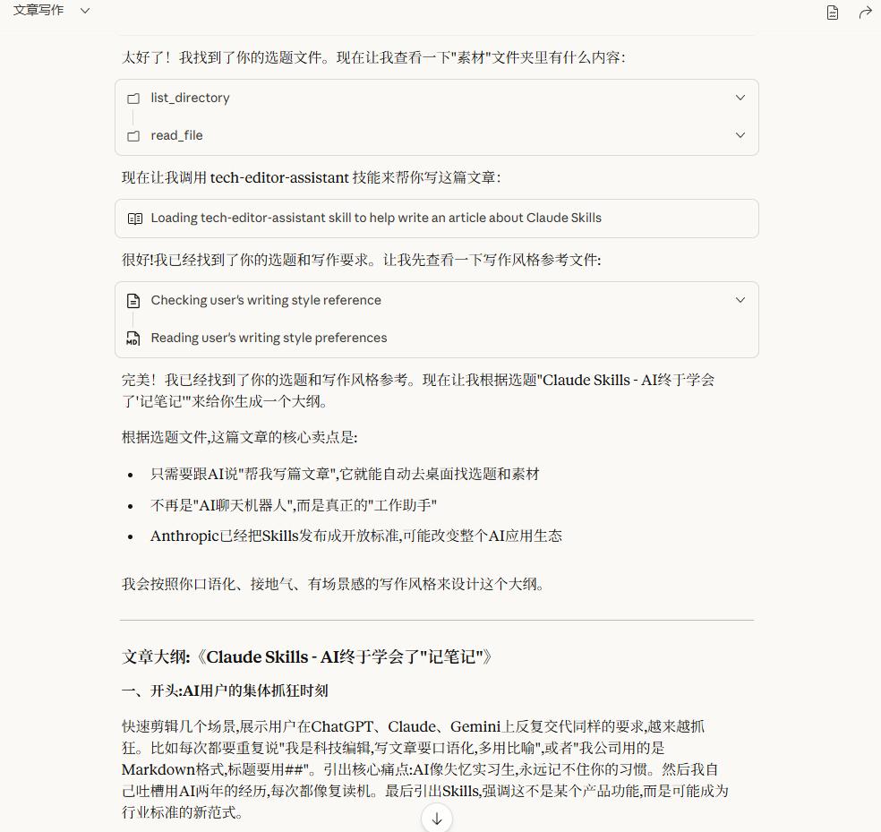 它是直接在自己技能库里搜索到了这个写稿技能,接着像个老练的编辑一样,自己去里面翻选题,自己去对风格,然后不到 1 分钟,一份大纲直接甩在了我脸上。