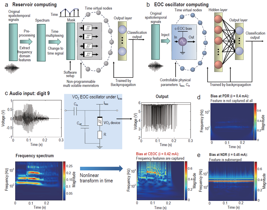 更引人注目的是,团队证明单个在混沌边缘区域工作的VO₂器件具有显著的频率敏感特性,能够直接进行频域特征提取。在语音识别任务中,仅凭单个器件的动力学响应即可实现92%的识别准确率,其性能相当于一个具有频域预处理功能的两层卷积神经网络。这意味着,单个混沌边缘器件可完成传统计算中需大量无源器件才能实现的任务,并额外具备了类似生物耳蜗的语音频域预处理功能。