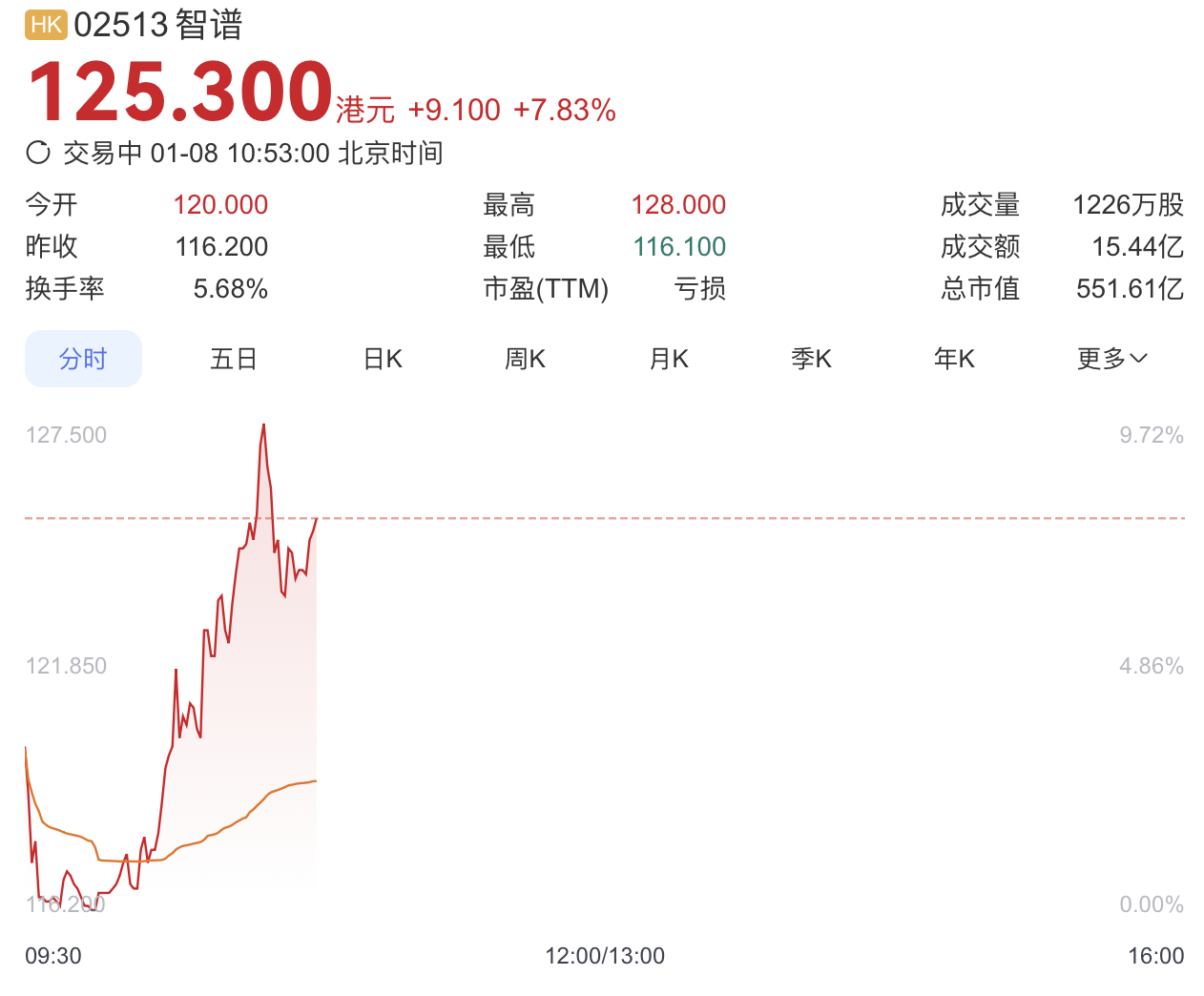 截止发稿,智谱股价上涨7.83%,总市值551.61亿港元。