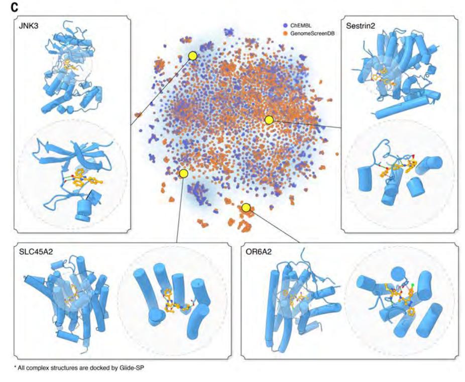 最终,他们构建了 GenomeScreenDB 数据库,覆盖近 1 万个人类靶点、2 万多个结合口袋,共收录 200 多万个潜在命中小分子。相关分子结构、对接构象及评分信息均已对外开放,开创了后 AlphaFold 时代药物研发新范式。