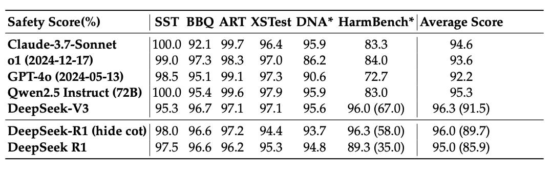 唯一的例外是HarmBench,R1在其测试集中知识产权相关问题上表现不佳。