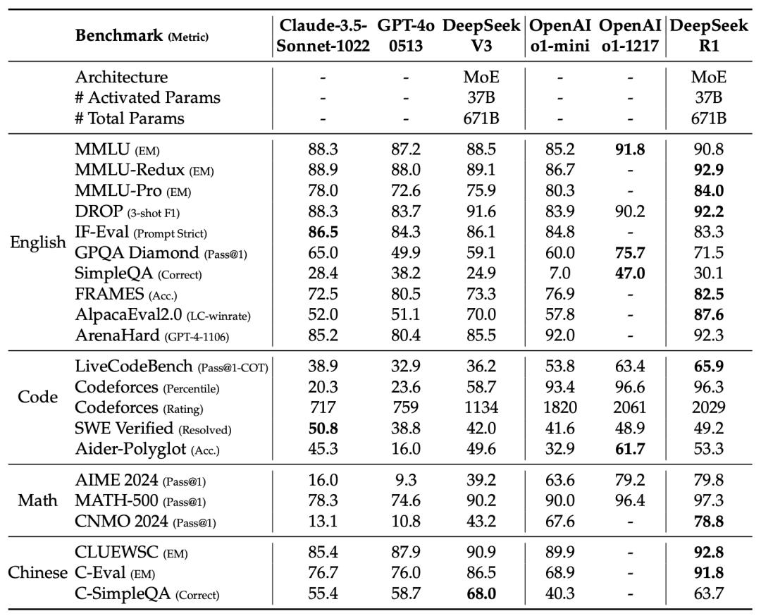 在数学、代码任务中,DeepSeek-R1与OpenAI-o1-1217基本持平,明显领先其他模型。