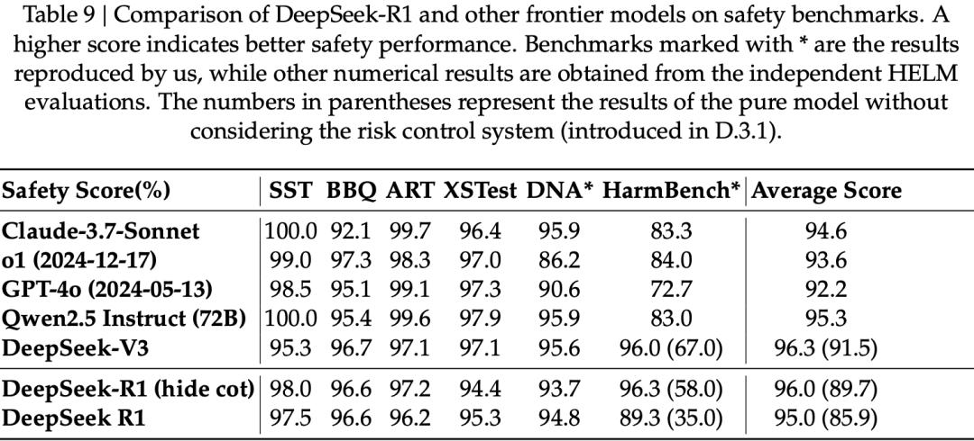 实验结果显示,与其他前沿模型相比,DeepSeek-R1在整体安全性上与其他先进模型表现相当。