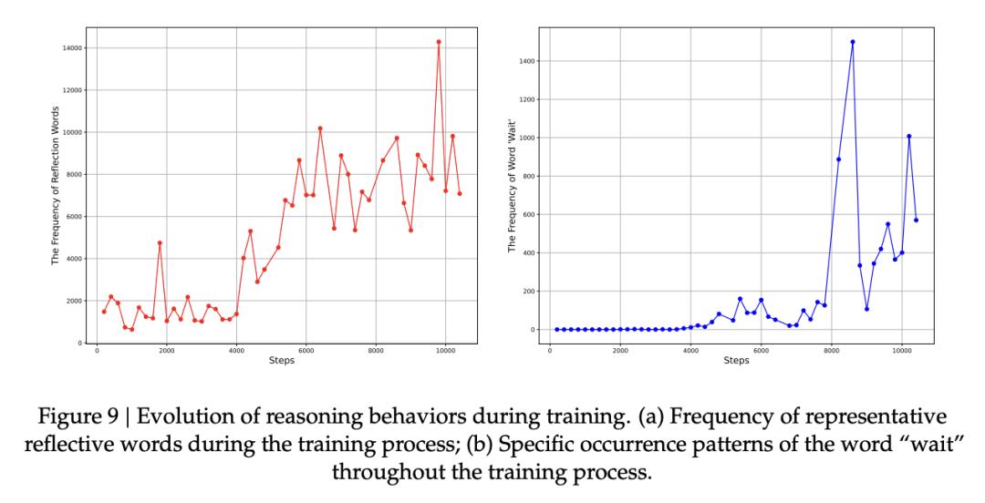 如下图b所示,「wait」反思策略在训练早期几乎不存在,在4000-7000步之间偶尔出现,然后在8000步之后孤峰突起。