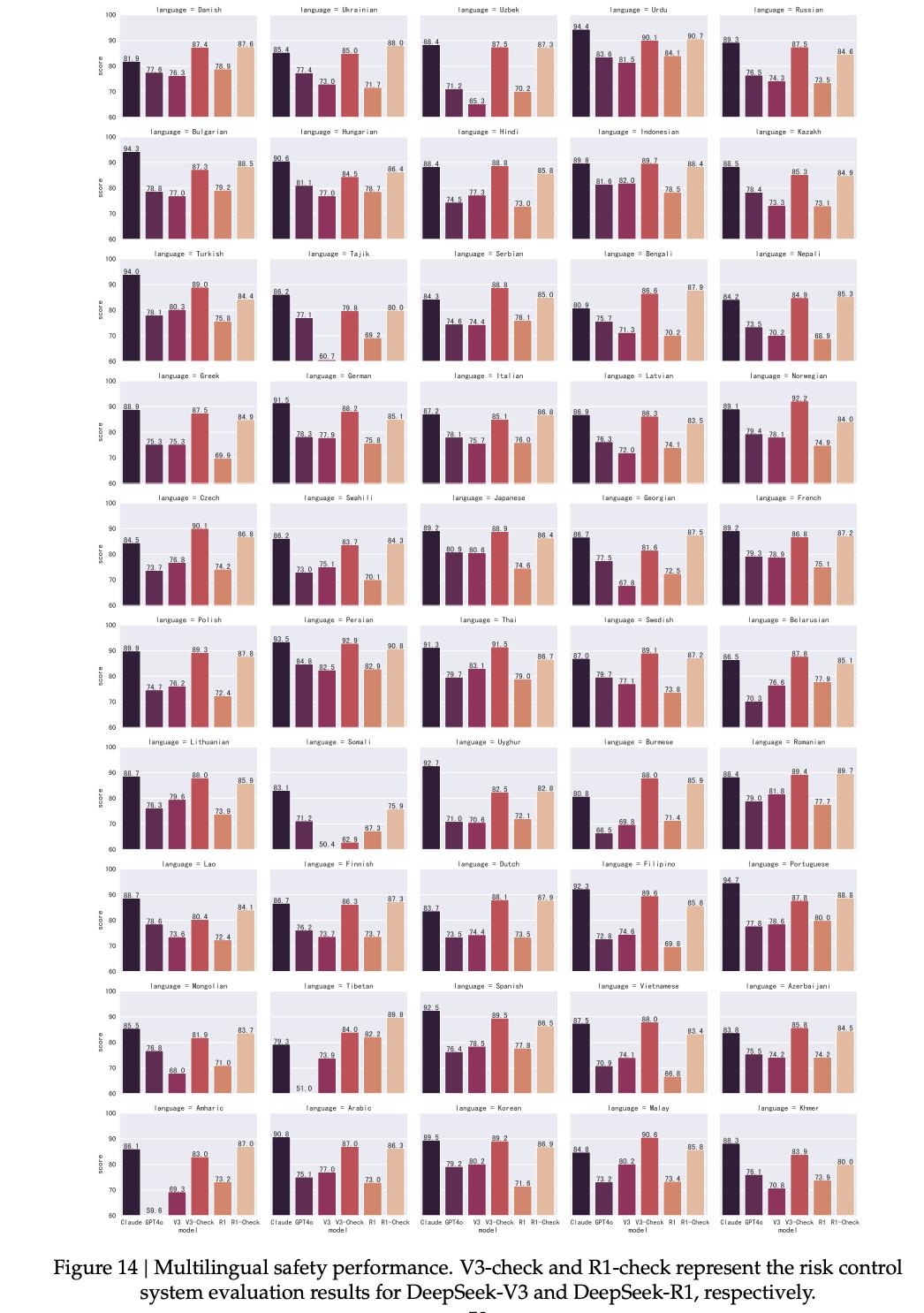 图14中展示了DeepSeek-V3、DeepSeek-R1(启用与未启用风险控制系统)以及Claude-3.7-Sonnet和GPT-4o(2024-05-13)在50种语言下的表现。