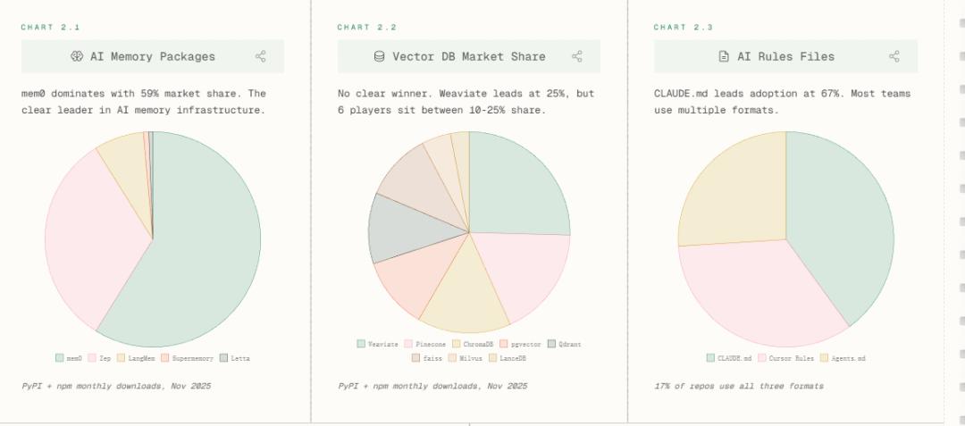 效率跃升的背后,是支撑性技术栈的激烈重构。报告以不同大模型提供商的SDK下载量为考察变量,发现在AI记忆模块中,mem0以59%市占率一骑绝尘;而对比向量数据库「六强混战」(Weaviate 25%领先,Chroma/Pinecone/Qdrant等紧咬)。