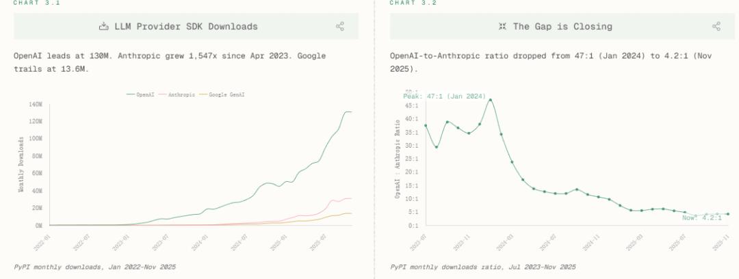 虽然起步较晚且基数较小,但自2023年下半年开始,其下载量呈指数级爆发,到2025年11月已达到4300万次,实现了自2023年4月以来1547倍的惊人增长,Open AI和Anthropic的比值已从47:1缩至4.2:1——开发者正在用脚投票,向更开放、更可控、更可编程的接口迁移。