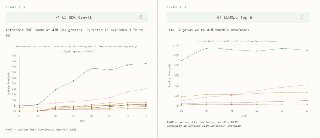 LLMOps层,LiteLLM增长4倍至4100万下载,LangSmith借LangChain生态捆绑上位。这印证一个趋势,即模型调度、监控、降级已从「可选项」变为「基建标配」。