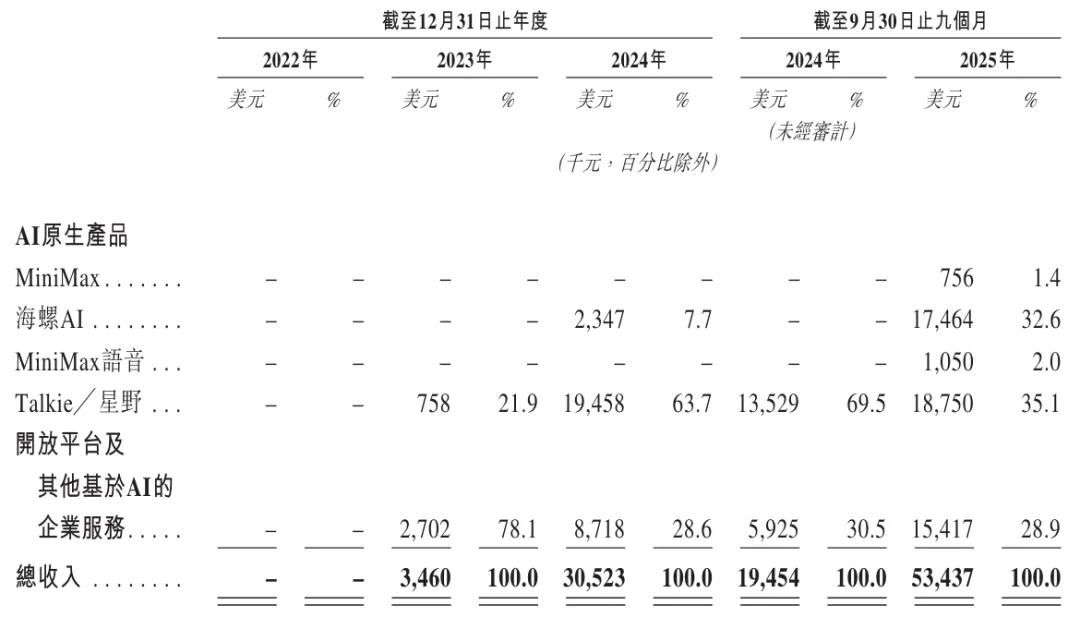招股书显示,MiniMax在2025年前9个月来自MiniMax收入为75.6万美元,占比为1.4%;来自海螺AI收入为1746.4万元,占比为32.6%;来自MiniMax语音收入为105万美元,占比为2%;