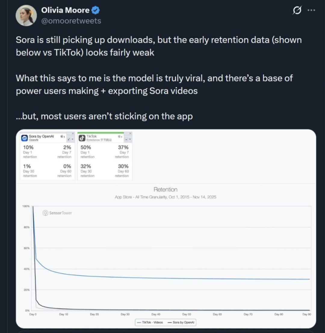 从上线初期Sora App的火爆程度来看,AI分身、AI客串、AI混剪等玩法,吸引了很多早已跃跃欲试的尝鲜用户,上线四天即登顶美国区App Store免费应用榜。然而,12月初a16z合伙人Olivia Moore分享的一组数据,却给OpenAI泼了一盆冷水。数据显示,上线以来Sora App的用户留存率直线下滑,90%的用户一天即走,98%的用户没有坚持过一周,两个月后,第一批涌入的用户已经悉数离开。