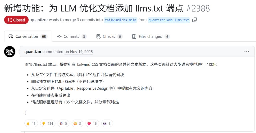 2025 年 11 月,一位用户 quantizor 希望新增一个 llms.txt 接口,用于向大模型提供经过优化的项目文档内容,方便 LLM 更好地理解和使用该项目。