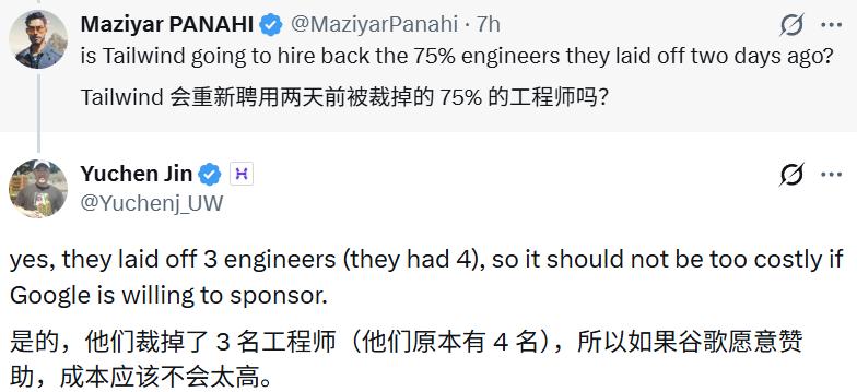 这个故事略显悲伤,但却有一个还算不错的暂时结局:Tailwind 的呼救被听到了,谷歌等多家公司伸出了援手。