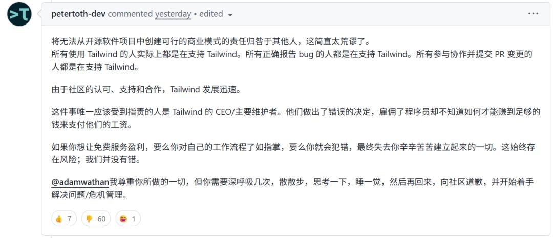 有开发者直言不讳地在下面评论说 Wathan 拒绝这个 Pull Request 并将其归因于 AI 的做法是错的,他表示:「这件事唯一应该受到指责的人是 Tailwind 的 CEO / 主要维护者。他们做出了错误的决定,雇佣了程序员却不知道如何才能赚到足够的钱来支付他们的工资。」