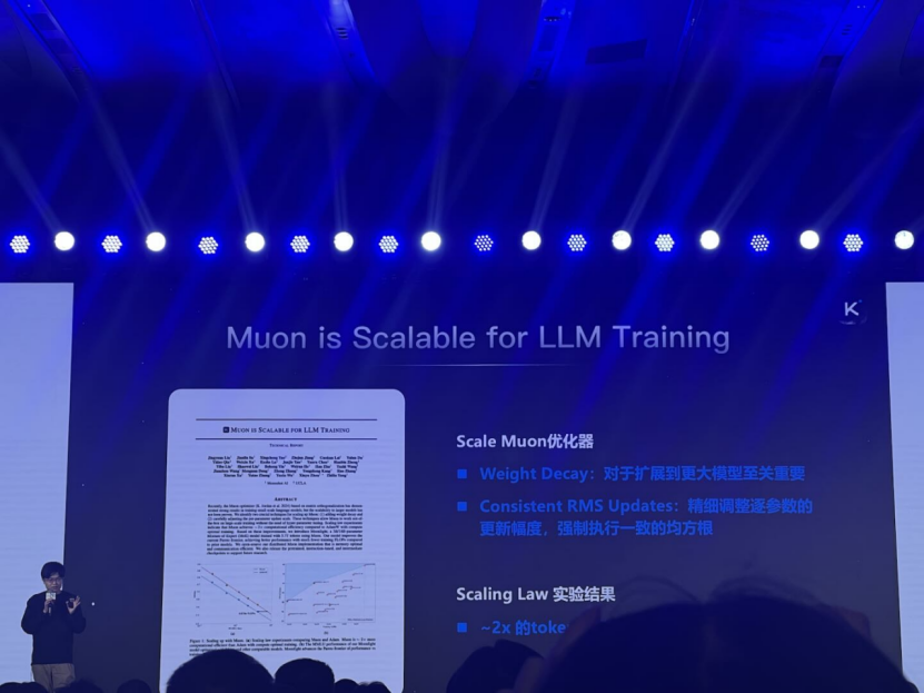 “我们发现可能基于MUON二阶优化器,它的效果会非常好,体现在它有两倍的Token Efficiency的提升。”在月之暗面CEO杨植麟的分享中,他反复提到Token Efficiency这个概念,“你的Token Efficiency越高,意味着你可以用尽可能少的Token得到一样的效果。”
