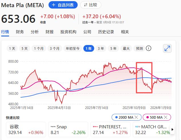 红框标注:10月30日Meta发布2025年第三季度财报后下跌