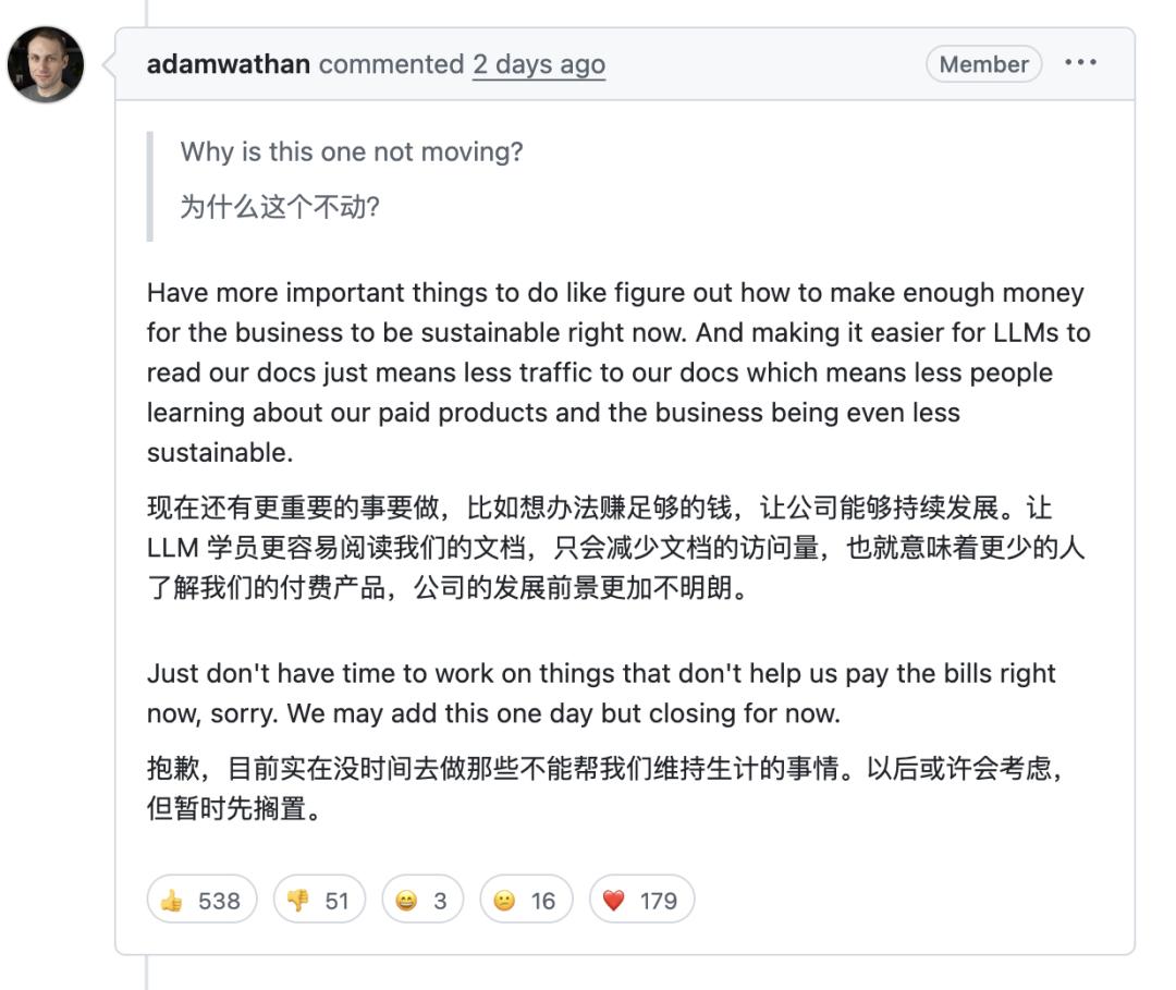 AI造成访问量下滑,从而损害公司利润,Wathan不是不知道这条逻辑链。