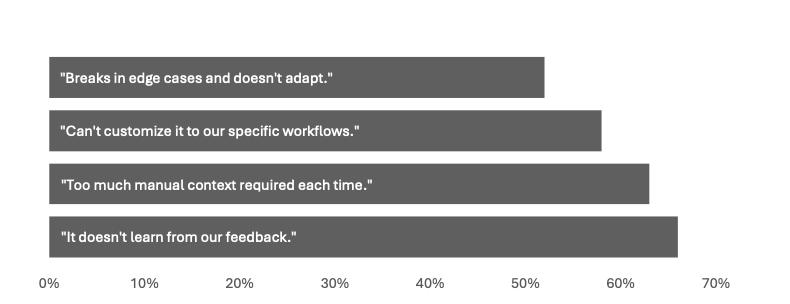 报告一针见血地指出,这些工具失败的核心原因在于它们缺乏「学习能力」。大多数企业级 AI 系统无法保留用户反馈、无法根据上下文自适应,也无法随着时间灵活变化。