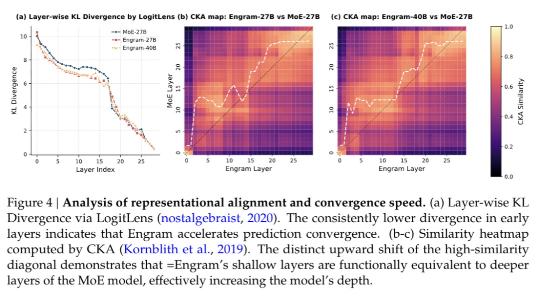 这意味着 Engram 实际上“加深”了网络的有效深度,省下来的层数被用于更复杂的推理任务。