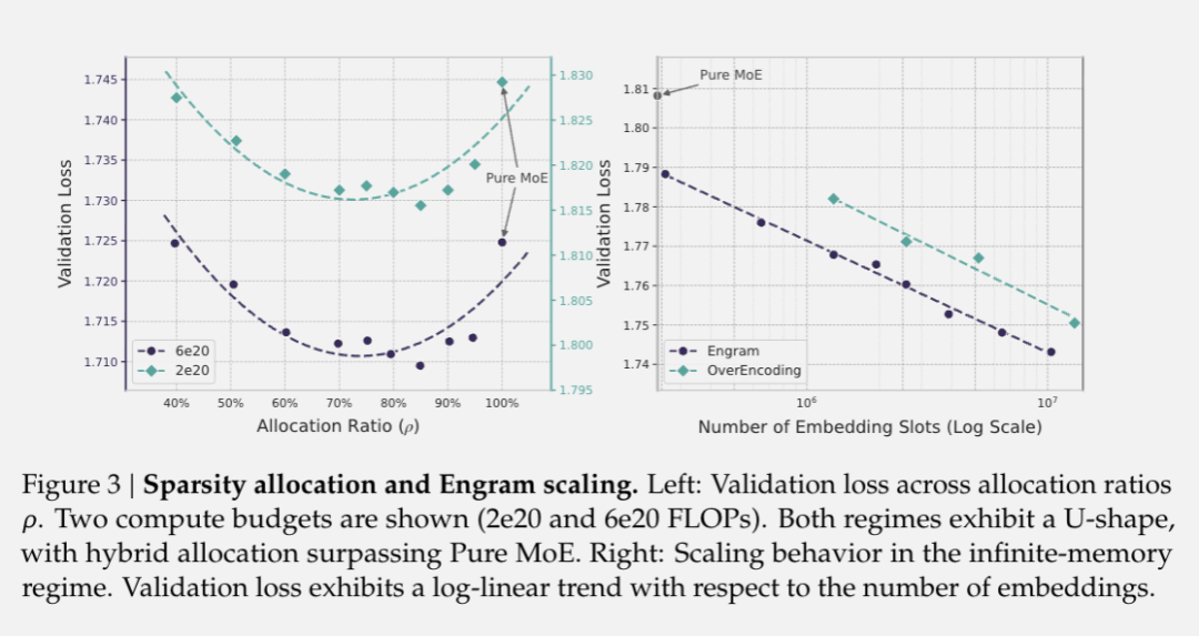 纯 MoE 反而不是最优解,把大约 20% 到 25% 的稀疏参数预算分给 Engram 记忆时,模型验证集 loss 达到最低点。