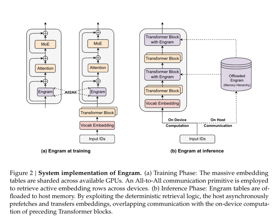 在训练阶段,词表规模会高达 100B 参数,单个 GPU 存不下,必须拆分到多个 GPU 上,需要 All-to-All 通信机制,让所有 GPU 之间互相传递需要的记忆片段。