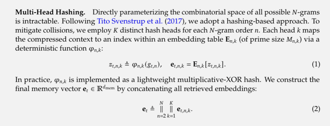 又减少查找冲突:给每种 N-gram 阶数(比如 2-gram、3-gram)配 K 个不同的哈希头,每个哈希头对应一个独立的 embedding 表,把所有 N-gram 阶数、所有哈希头取出来的 embedding 向量拼在一起,形成最终的“记忆向量”eₜ,供后续模块使用。