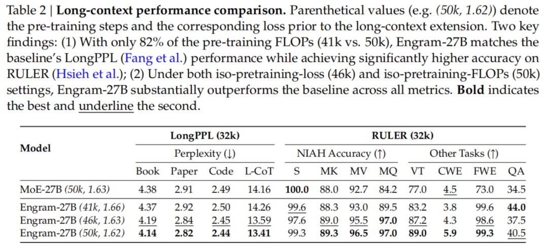 通过长上下文扩展训练,作者证明了Engram在长程检索和推理任务上带来了显著的提升。