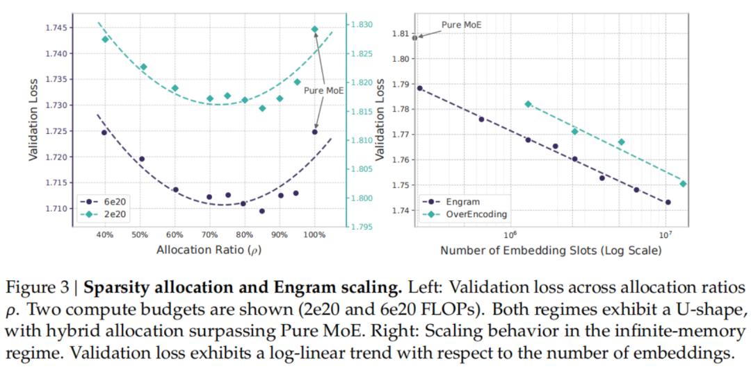 在探索的范围内,曲线遵循严格的幂律,这表明Engram提供了一种可预测的扩展调节手段:更大的内存能持续带来收益,而无需额外的计算量。