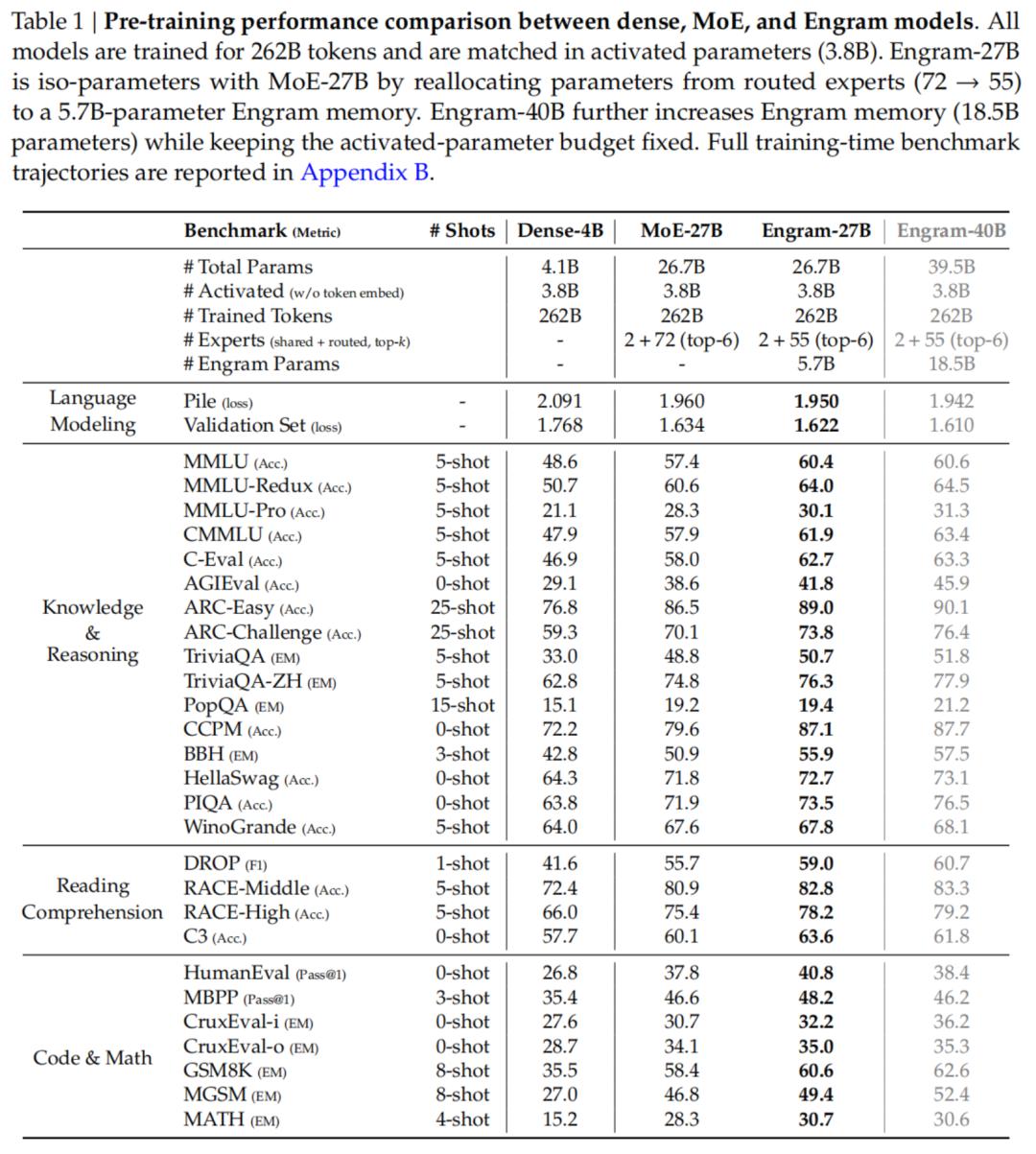 在相同的训练计算预算下,所有三个稀疏变体(MoE-27B,Engram-27B/40B)在所有基准测试中都显著击败了等FLOPs的Dense-4B基线。