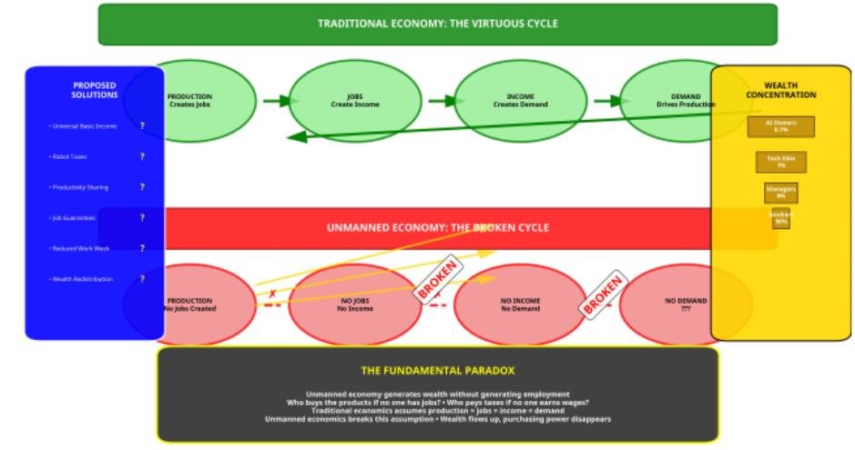 但关键问题是,谁将从这些财富中获益?答案显而易见。传统的经济模型假设生产创造就业,就业创造收入,收入创造对更多生产的需求。无人经济打破了这一循环。当一家“黑暗工厂”在不雇用工人的情况下生产商品时,顾客从哪里获得购买这些商品的资金?当零员工公司在不支付工资的情况下创造利润时,谁拥有维持经济运转的购买力?