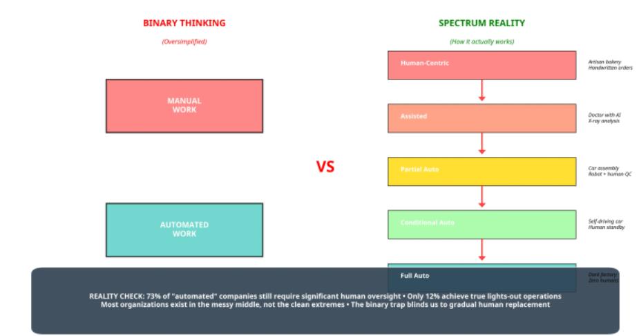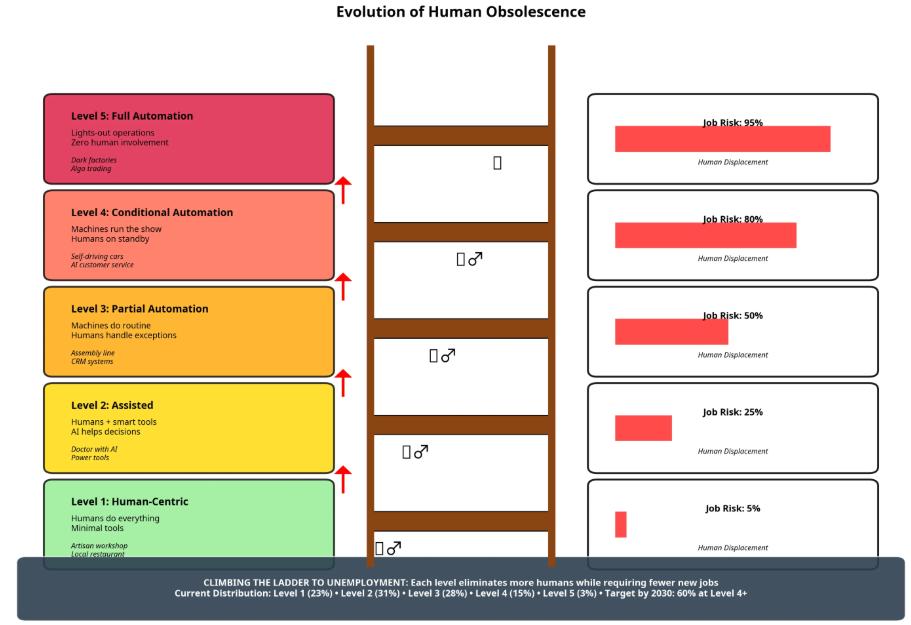 这个框架无法预测未来,但它描绘了现状。一旦你发现了其中的模式,就无法忽视。每家公司发布的关于“数字化转型”或“运营效率”的公告,实际上都不过是发布一份关于在这个框架下向东南方向移动的新闻稿。每一次人工智能的实施,都是人类走向边缘化的一步。每一个自动化项目,都是通往完全无人值守运营的阶梯上的又一级。