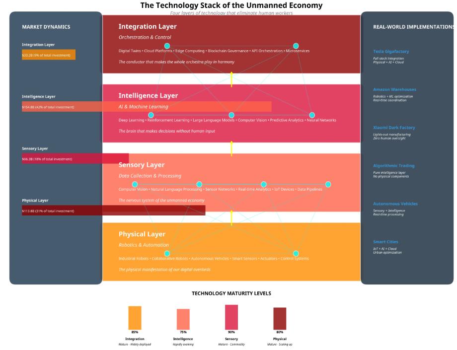 资金正以前所未有的速度流向人力替代领域。仅2024年一年,投资额就高达3685亿美元。投资模式揭示了全球经济的真正优先事项:近一半的无人经济投资流向了人工 智能软件公司——这些公司旨在无需人类员工即可运营;另有三分之一的资金流入了制造业自动化领域,这将导致工厂工作岗位的消失。