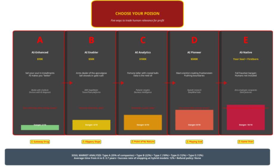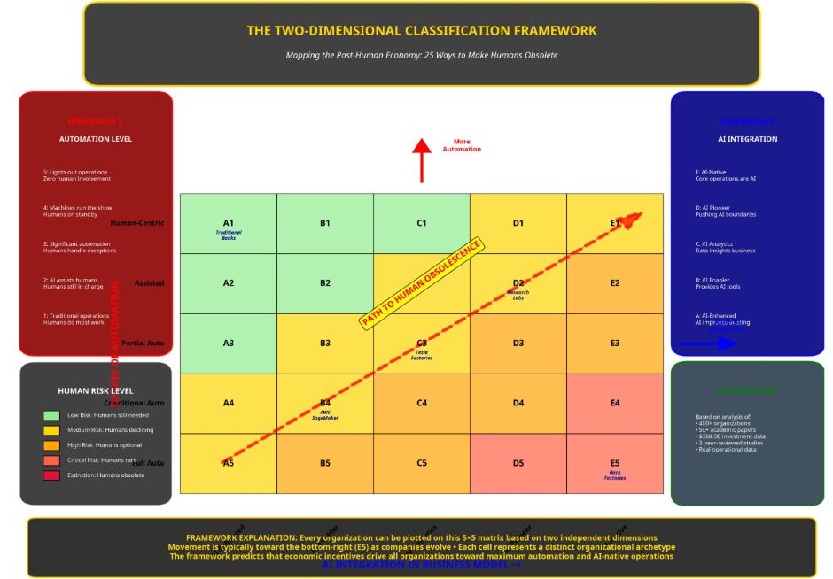 在分析了数百家机构并阅读了足以获得“卧槽,我们都完蛋了”博士学位的学术论文之后,我开始开发一个简单的分类系统,希望能真正理解这种混乱局面。这是一个二维框架,它根据公司的自动化程度以及人工智能在其商业模式中的融入程度来对其进行分类。你可以把它想象成后人类经济的元素周期表,只不过在这里,我记录的是人类被淘汰的不同方式。