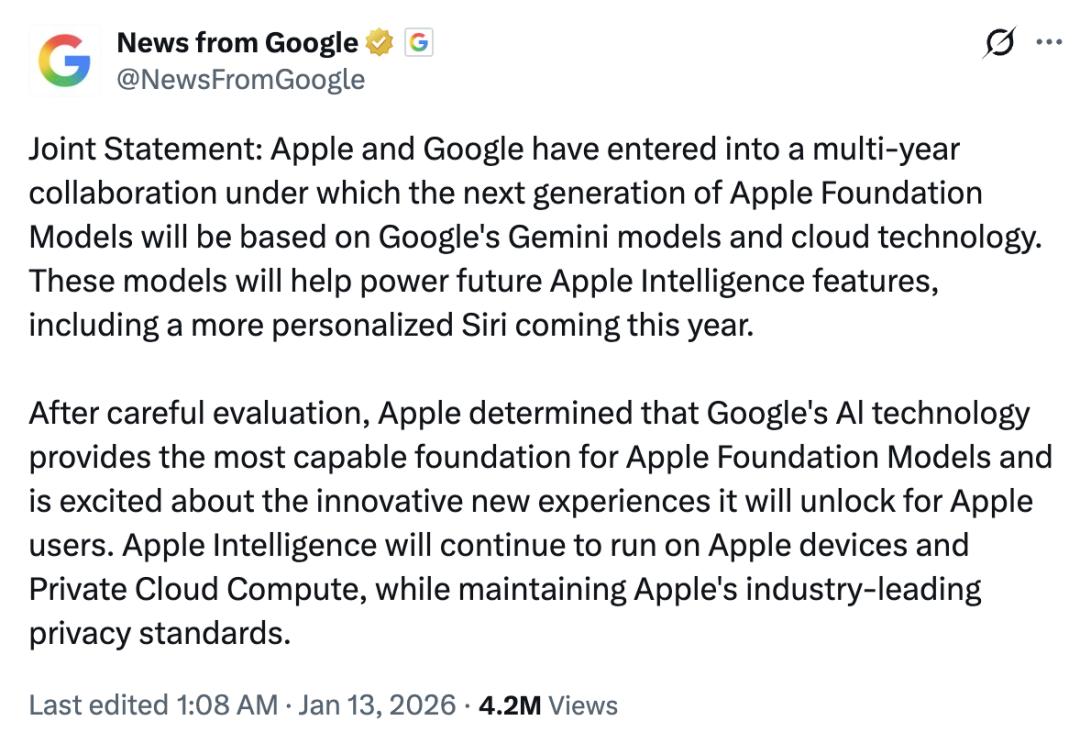 这场价值数十亿美元、为期多年的合作,有望成为苹果追赶AI浪潮的关键一步,更是谷歌在对抗OpenAI战役中赢下的标志性一役。巨头合纵连横,全球AI竞赛进入资源整合与生态对决的新阶段。