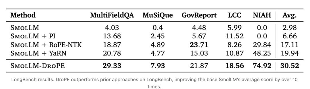 在LongBench基准测试里,DroPE将基础SmolLM的平均得分提高了10倍以上。