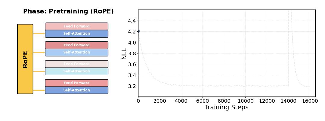 而到了推理阶段,则大胆地丢弃位置嵌入,并在原上下文长度下进行简短的重新校准。
