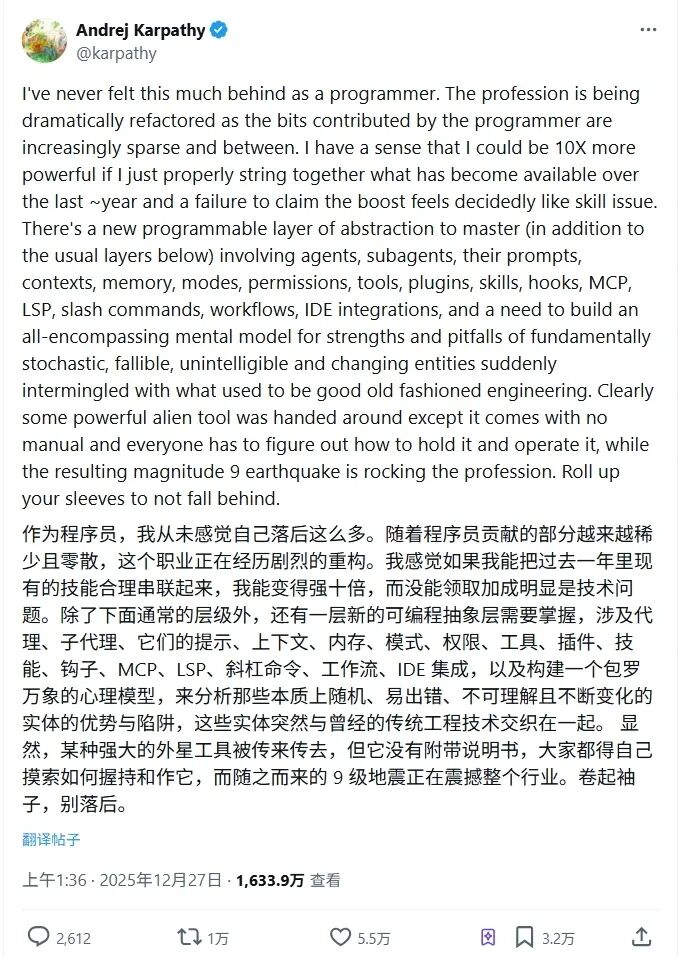 2025年12月27日,Andrej Karpathy在推特上发了一条长推文。