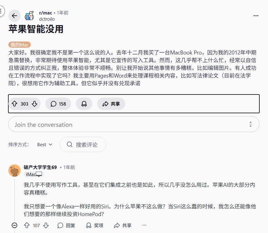 我看了一下,老外对Siri的不满主要集中在准确度差、功能有限,AIGC体验令人失望上,就像上面这种帖子,在国外贴吧Reddit里起码有成百上千条,随随便便都能骗到三百多赞,你就知道有多少老外在共鸣了。