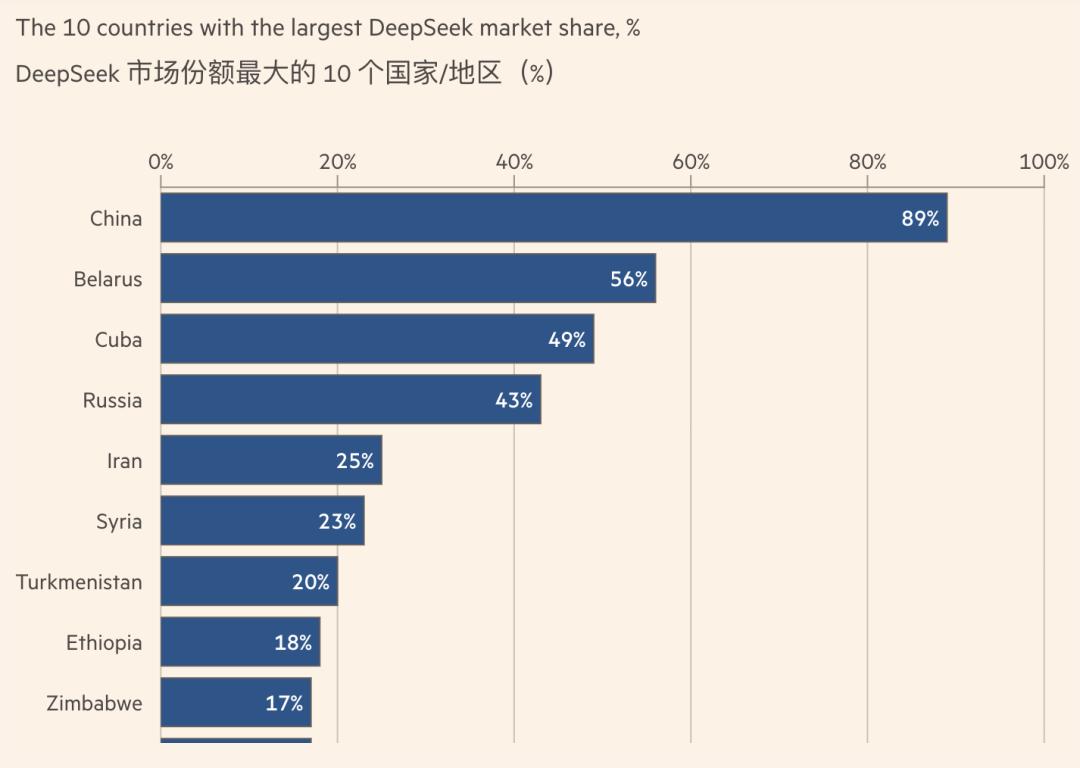 微软基于内部数据的研究显示,DeepSeek R1 极大推动了全球大多数地区的 AI 普及,在白俄罗斯拿下 56% 的份额,古巴 49%、俄罗斯 43%,即便是埃塞俄比亚和津巴布韦,份额也分别达到 18% 和 17%。