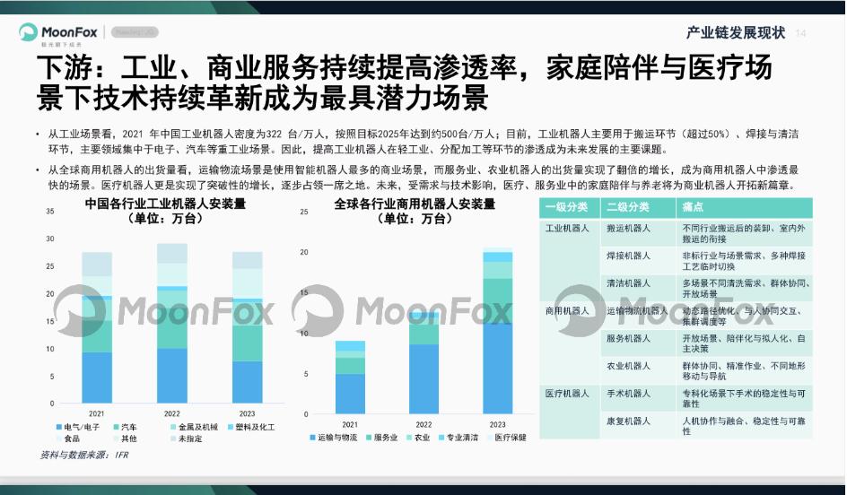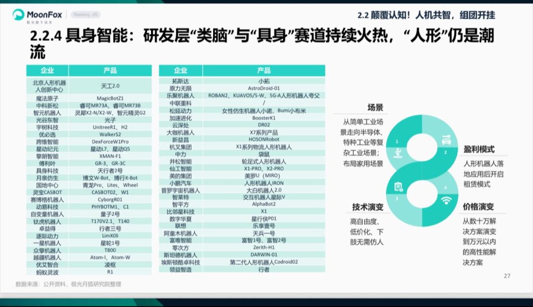 场景落地的攻坚同样刻不容缓,“工业先于物流,商用先于家用”的商业化路径,成为企业争抢生存赛道”。对于行业整体趋势月狐数据方面也有相关研究,目前应用场景已从工业单一作业拓展至居家服务、医疗保健等生活领域;盈利模式也愈发多元,涵盖人形机器人属地化运营、租赁等形式,产品价格从数万元向万元内下探,性价比提升推动市场化普及。