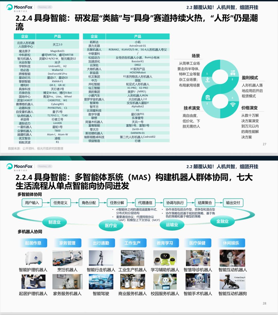 月狐数据研究报告显示,行业研发层面正聚焦“认知智能+物理智能”融合,人形机器人向自主决策升级;对“空间智能”的深度突破,是未来人形机器人打通与物理世界交互链路的核心所在。多智能体系统(MAS)实现机器人群体协同,已在制造、医疗、金融等多个领域落地应用。