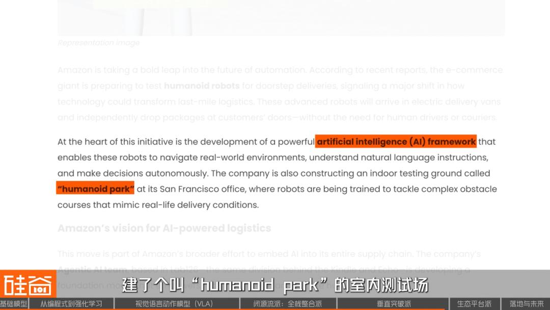 但这100万台机器人,全都是专用机器人,针对具体场景优化:Hercules能搬运1250磅货物,Pegasus用于包裹分拣、运输,但亚马逊的野心不止于此。他们的Agentic AI团队正在开发通用机器人基础模型,还在旧金山办公室建了个叫“humanoid park”的室内测试场,训练人形机器人应对复杂障碍。