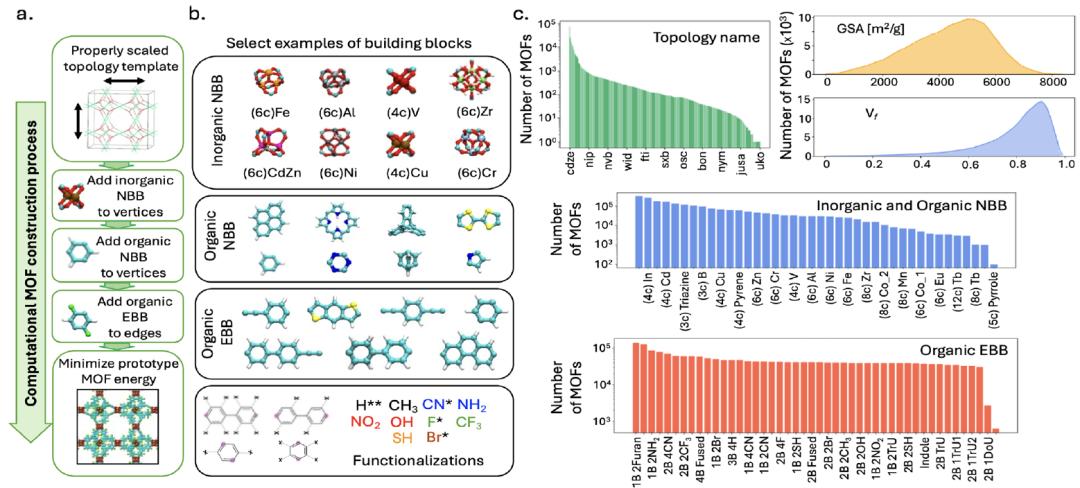 为了支撑模型训练,研究团队构建了一个规模庞大的 MOFs 数据集 MOFMinE,涵盖约 100 万个 MOFs 原型,包含了从构件选择、拓扑模板映射到功能化修饰的全流程信息,如下图: