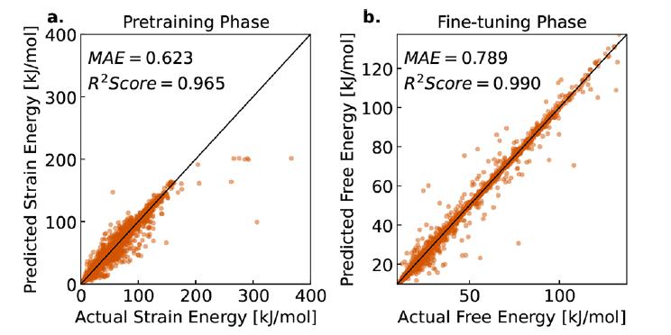 在预训练阶段,模型通过应变能数据进行训练,取得 MAE 为 0.623 kJ/molMOFatom,R² 为 0.965,如下图 a。这一阶段的高相关性表明,应变能数据能够为自由能预测提供有效的初步信息,验证了研究团队预训练策略的合理性。进一步分析显示,预训练的应变能与微调后的自由能高度相关,证明了应变能作为低成本代理指标在模型训练中的价值。