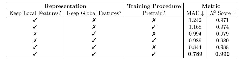 为了深入理解模型性能来源,团队进行了系统的消融实验。实验分别考察了局部特征、全局特征以及预训练对自由能预测的影响。结果如下表: