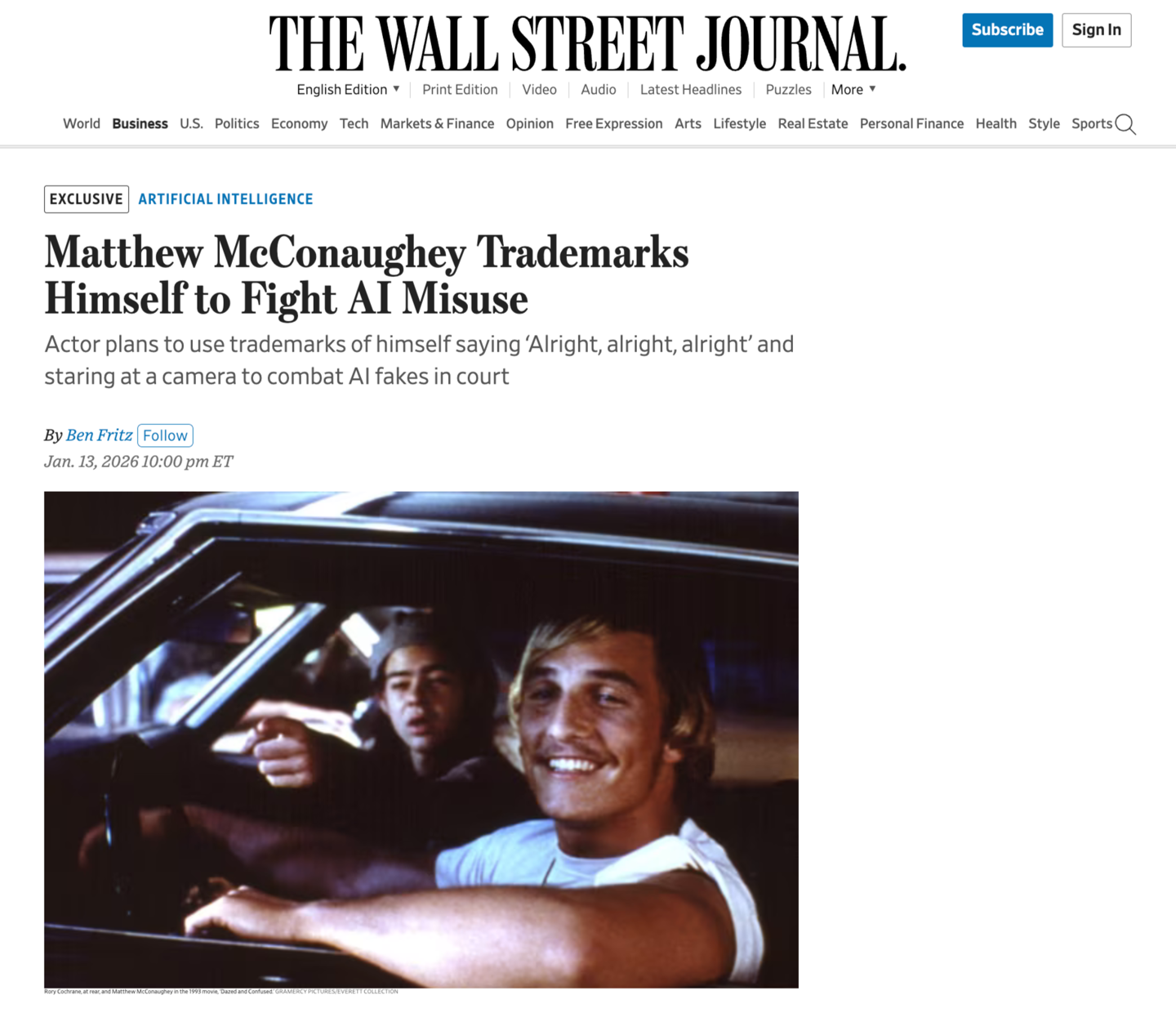 IT之家 1 月 16 日消息,当地时间 1 月 13 日,据《华尔街日报》报道,奥斯卡影帝马修 · 麦康纳开始动用商标法,为自己的声音和形象筑起法律防线,以应对 AI 时代的未经授权使用风险。