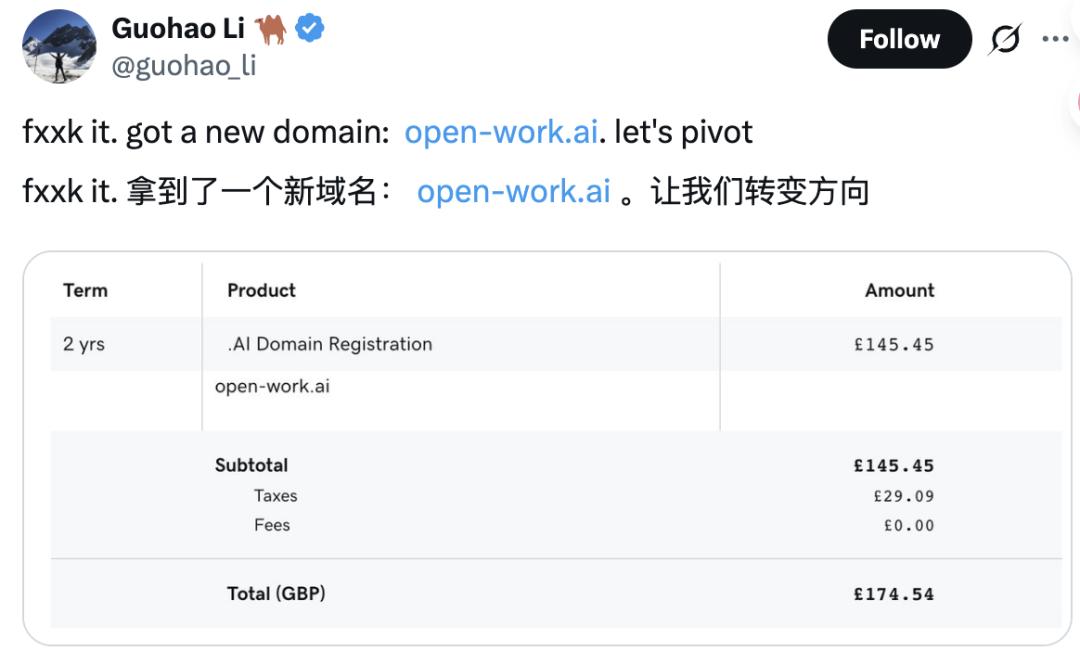 在Claude Cowork发布后,Guohao Li迅速入手了心仪的open-work.ai域名。