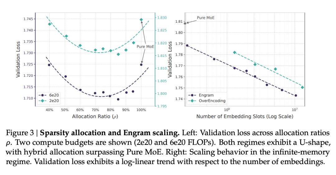 基于这个洞察,DeepSeek 不再仅仅将 N-gram 视为简单的词表扩展,而是将这一实验性结论升华为「条件存储」(Conditional Memory),这是一条与条件计算(MoE)并列的 scaling law 新轴线。在此基础上,他们提出了「稀疏分配」(Sparsity Allocation)问题:在固定参数预算下,如何在 MoE 专家与静态存储模块之间分配参数?实验揭示了一条 U 型缩放规律 —— 全押 MoE 并非最优解,将约 20%-25% 的参数分配给 Engram 反而效果更好。