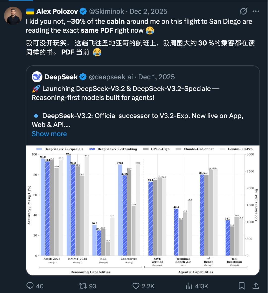每次 DeepSeek 一发论文,推特上都能引发不小的轰动,有位博主甚至提到他搭乘的飞机上有 30% 的人都在看 DeepSeek 刚发的论文。