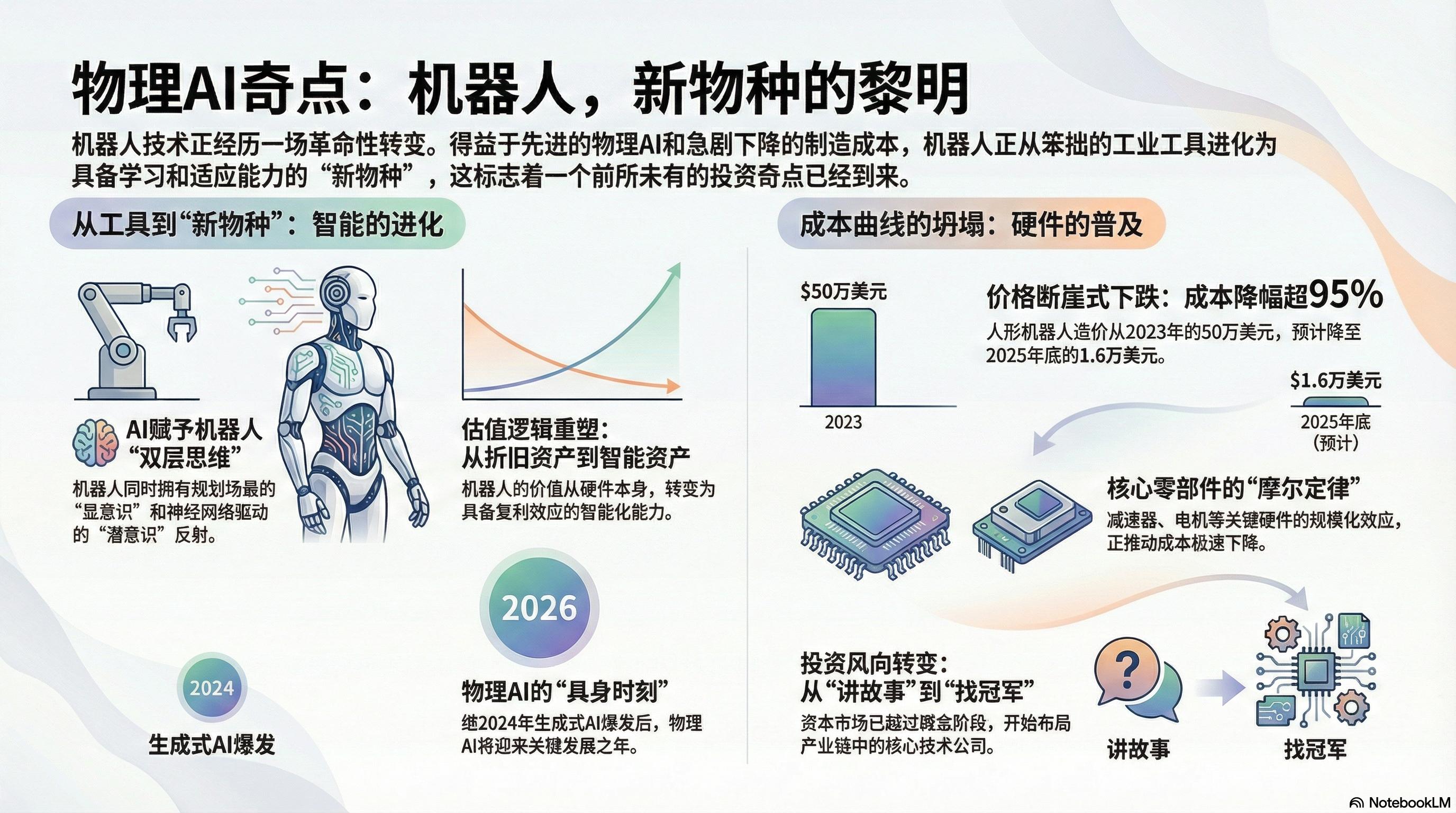 站在 2026 年的关口,风向开始变了。具身智能的技术突破、政策红利的共振,加上硬件成本的断崖式下跌,几股力量正汇聚在一起。大家开始意识到,这不再是科幻片里的愿景,而是一场正在发生的资产重估。